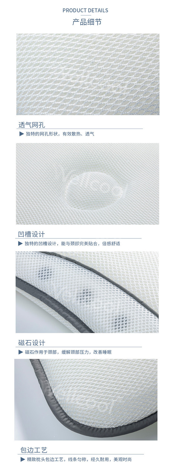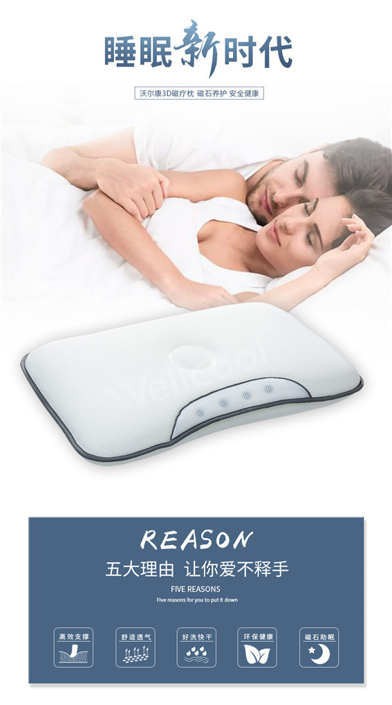 沃爾康3D磁療枕采用3D材料填充和磁石結(jié)合, 既可以透氣可水洗,保持枕頭的干凈整潔又可以助眠,一舉兩得。